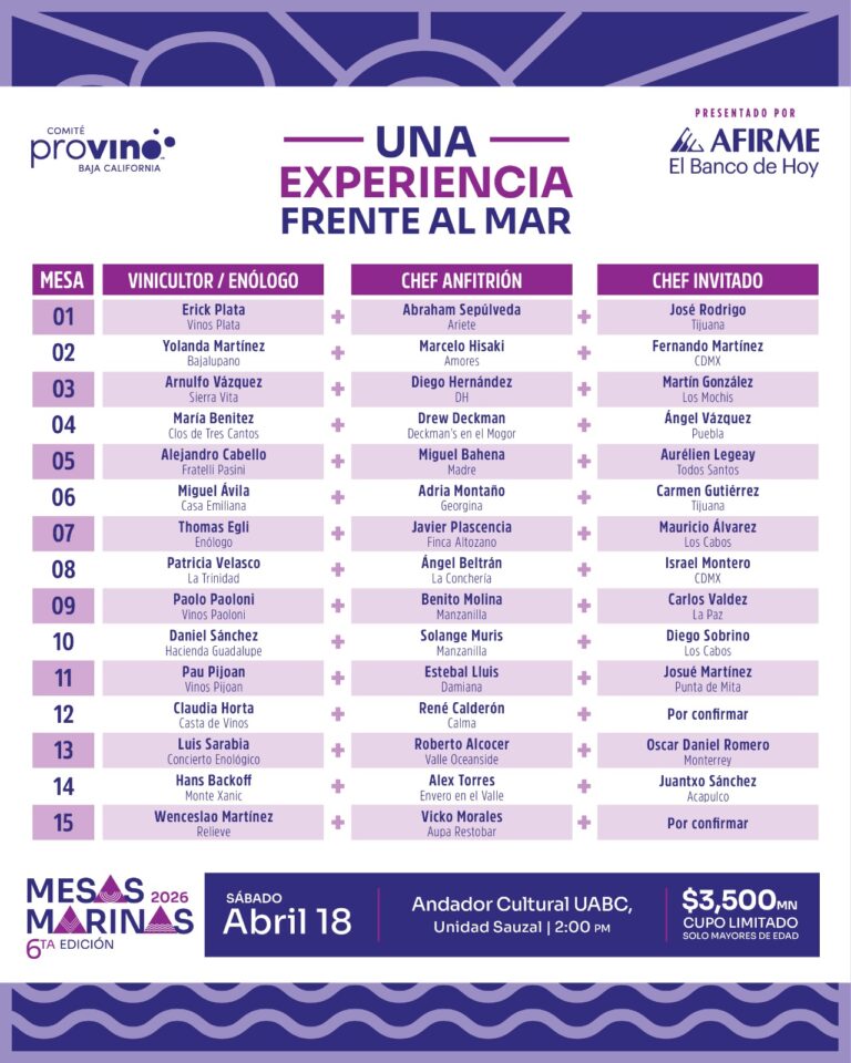 Como parte del Festival de las Conchas y Vino Nuevo, este evento reune lo mejor de la cocina marina y de los vinos de Baja California, resaltando el producto bajacaliforniano en 15 mesas de 20 comensales, cada una atendida de manera exclusiva por un vinicultor, un productor de conchas y un chef anfitrión en mancuerna con un chef invitado, quienes explicarán a detalle la experiencia enogastronómica a disfrutar. Postre a cargo de chefs reposteros invitados.